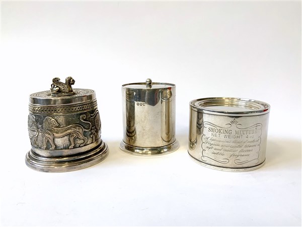 Lotto composto da tre porta tabacco, una in stile orientale in argento sbalzata ad animali lungo la fascia e motivo a cordonetto nei profili con presa del coperchio a sfinge a tutto tondo, unita a due scatole da barba in argento liscio, una con punzoni inglesi e l'altra inscritta "Smoking mixture" (g lordi 1150)