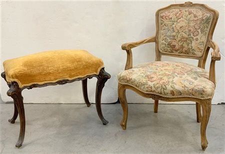 Lotto composto da una poltroncina e un panchetto di forma mossa in legno intagliato (difetti)
