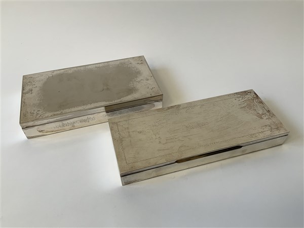 Lotto composto da scatola portapenne in legno rivestito in argento con coperchio inciso a motivi floreali, titolo 800, unita ad un'altra in metallo argentato