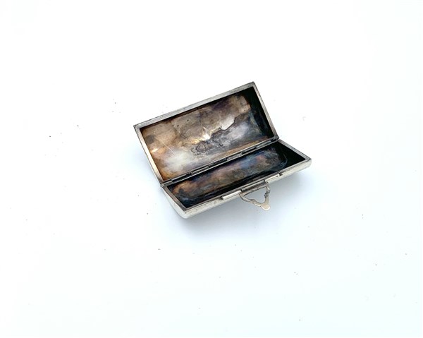 Tabacchiera in argento inciso con chiusura decorata con turchese cabochon. Titolo 800 (cm 9x2x5) (g 40)