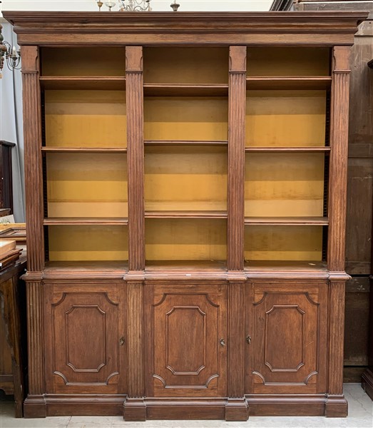 Libreria in legno con parte superiore a tre vani a giorno, parte inferiore a tre ante. Montanti scanalati (cm 195x230x38) (difetti)