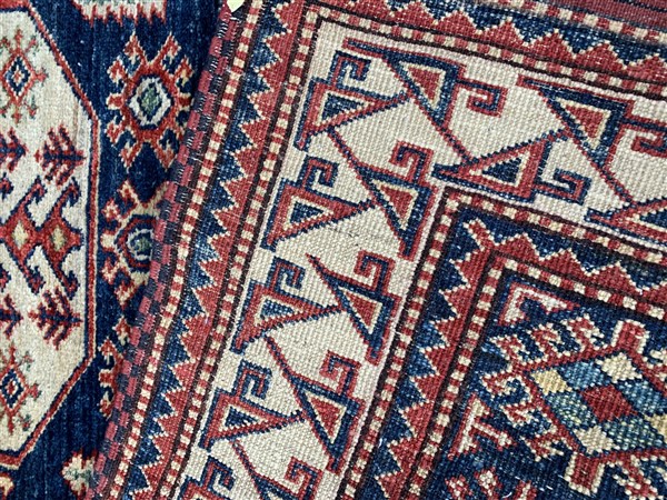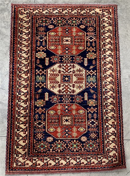 Tappeto Caucasico di moderna manifattura. Decoro con tre medaglioni ottagonali su campo blu (Lievi difetti)(cm 148x97)