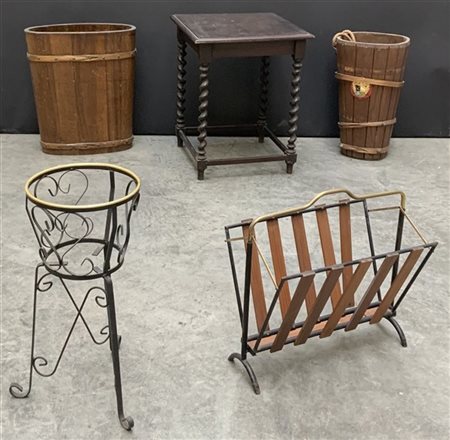 Lotto composto da due portaombrelli, un tavolino in legno, due portariviste e un portafiori in legno e metallo (difetti)