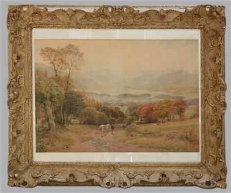 Ebenezer Wake Cook "Paesaggio lacustre con figure e armenti" acquerello (cm 62x9