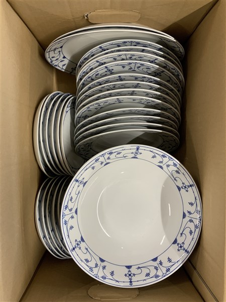 Cartone contenente una parte di servizio di piatti in porcellana con tese decorate a motivi geometrici blu composto da diciotto piatti fondi e dodici piani, undici piatti da frutta, due insalatiere e due piatti da portata (difetti)