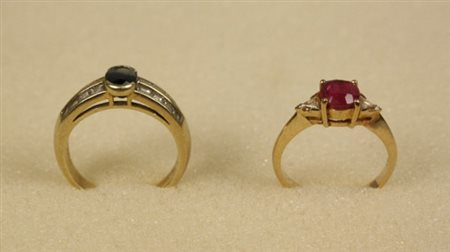 Firmato, datato. Due anelli di cui uno in oro giallo con rubino, gr. 4, ct. 1,10, con certificato e uno in oro giallo con zaffiro e diamanti, gr. 6. XX secolo.