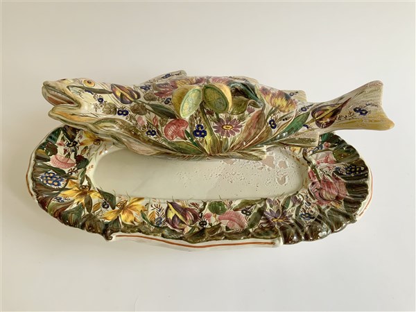 Lotto composto da un pesciera con vassoio in ceramica dipinta a fiori e presa a