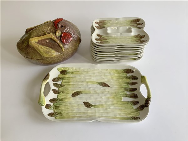 Lotto composto da un pesciera con vassoio in ceramica dipinta a fiori e presa a forma di limone, un servizio per asparagi con vassoio e dieci piatti, e una zuppiera con coperchio a forma di pollo. Manifatture differenti (difetti)