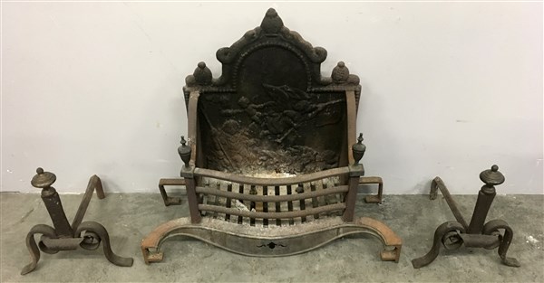 Lotto composto da un brucia legna con pannello decorato da figure in bassorilievo (cm 77x70x31) e una coppia di alari (l cm 41) (difetti)