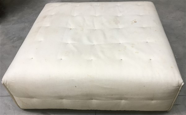 Grande pouf rivestito in tessuto bianco, piedini in plastica nera. Italia, produzione recente.
