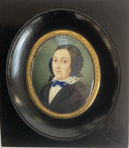 Scuola del secolo XIX "Ritratto di donna con fiocco blu" miniatura ovale (cm 6,
