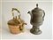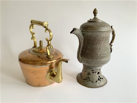 Lotto di due versatoi in ottone e rame sbalzato e inciso di manifatture differe