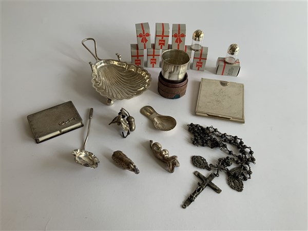 Cartone contenente bomboniere, gadget ed altri oggetti in argento e metallo argentato per usi differenti (g 700 ca) (difetti)