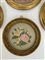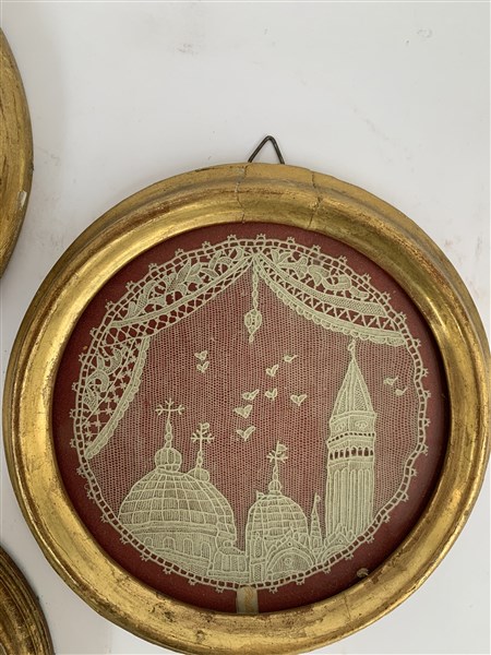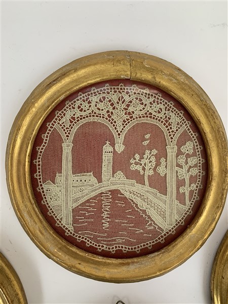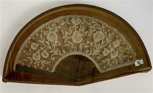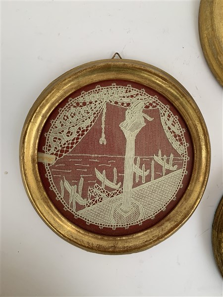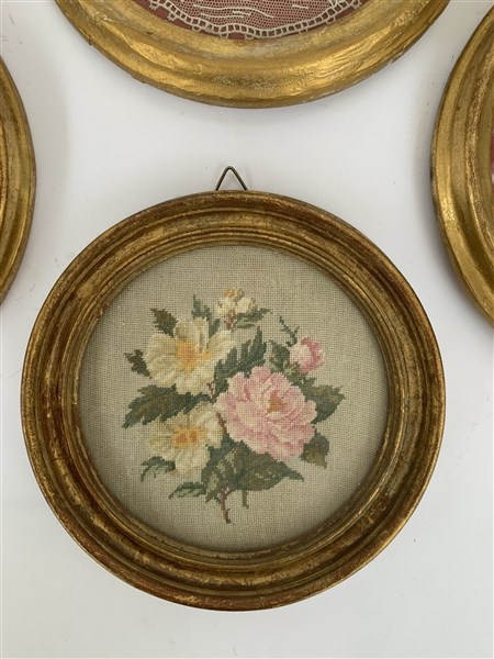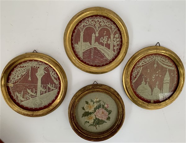 Lotto composto da un ventaglio e quattro ricami in cornici raffiguranti soggetti diversi(lievi difetti)