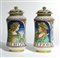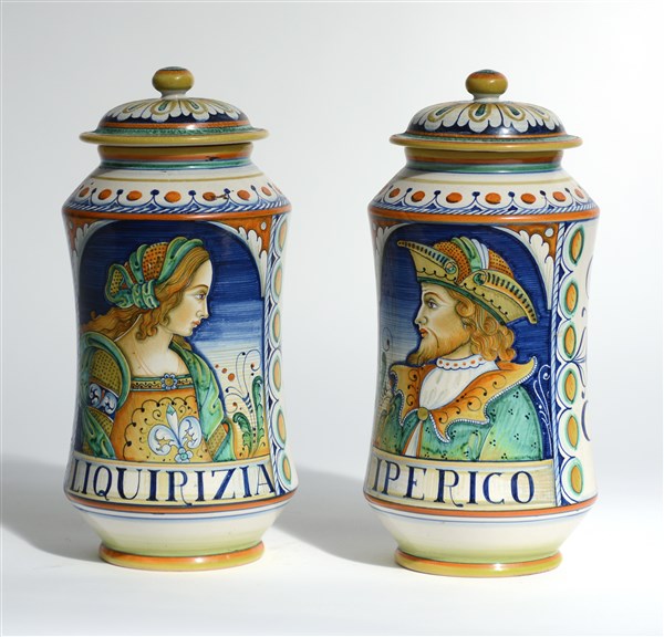 Manifattura di Deruta, coppia di vasi da farmacia in ceramica, dipinti con figu