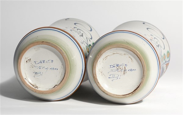 Manifattura di Deruta, coppia di vasi da farmacia in ceramica, dipinti con figure rinascimentali di profilo, nastri e motivi geometrici, marcati sotto la base (h cm 32) (lievi difetti)