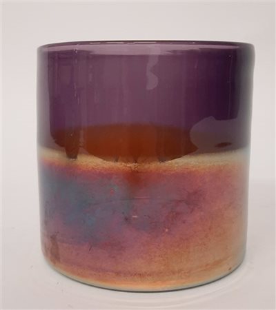 Vaso in vetro soffiato trasparente ametista con fascia inferiore iridata. (h cm 15; d cm 15)