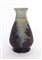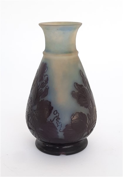 Vasetto modificato a lampada in vetro cammeo inciso all'acido nei toni del blu e del viola decorato con motivi vegetali e floreali. Francia, prima metà secolo XX. Firmato a cammeo "Gallé". (h cm 16)