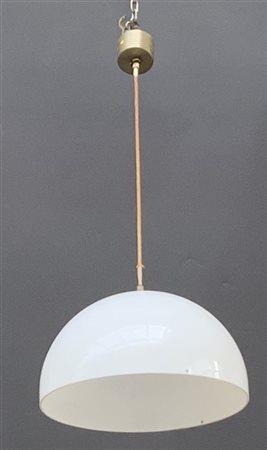 Lampada a sospensione con calotta in metacrilato bianco unita a due mensole semicircolari in cristallo con supporti in metallo e plastica nera. Italia, anni '70. (h cm 77,5; d cm 37,5) (lievi difetti e mancanze)