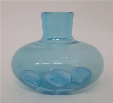 Vaso in vetro trasparente azzurro decorato con murrine lattimo e azzurre. Italia. (h cm 15)