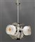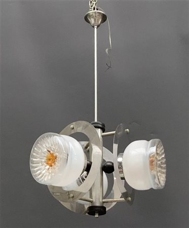 Lampada a sospensione a tre luci con struttura in metallo e minuterie in legno, paralumi in vetro trasparente incolore, lattimo e pagliesco. Italia, anni '70. (h cm 82) (lievi difetti)