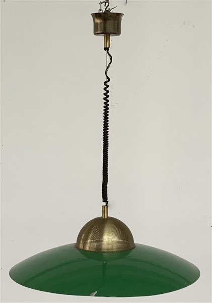 Lampada a sospensione con paralume in alluminio verniciato verde. Italia, anni '60. (h cm 90) (lievi difetti)