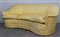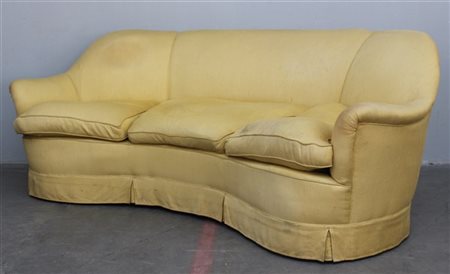 Divano a tre posti di forma curva imbottito e rivestito in tessuto giallo, piedini in legno massello troncoconici. Italia, anni '50. (cm 210x82x100) (lievi difetti)