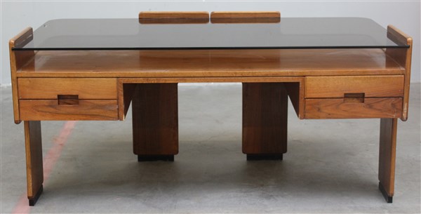 Scrivania in legno a quattro cassetti sottopiano, ripiano in vetro fumé. Italia, anni '50/'60. (cm 160x78x81) (difetti)