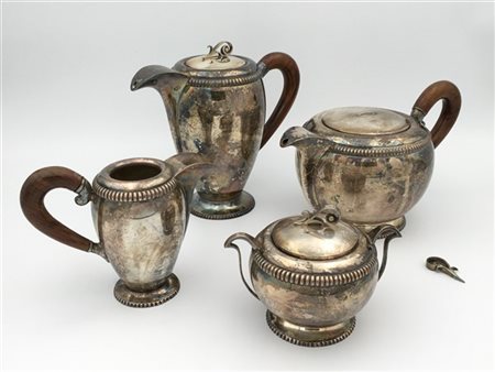Servizio da tè e caffè in metallo argentato con profili a baccellature composto da una caffettiera, una teiera, una lattiera e una zuccheriera. (difetti e mancanze)