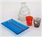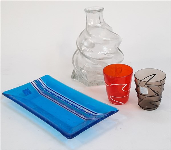 Lotto composto da due piccoli bicchieri e un porta oggetti in vetro di Murano marcati Abate Zanetti, uniti a una bottiglia in vetro stampato Torres. Secolo XX. Il porta oggetti in scatola originale. (misure diverse) (difetti)
