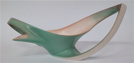 Centrotavola in ceramica smaltata sottovetrina azzurra e rosina. Torino, secolo XX. Marcata in nero sotto la base "VIBI TORINO ITALY" e con il numerale "315". (cm 47x22) (difetti)