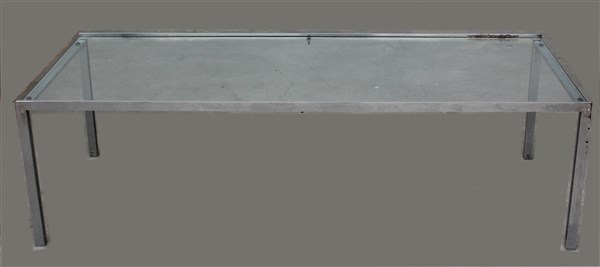 Tavolino da salotto. Produzione ICF, Italia, anni '70. Struttura in metallo cromato e piano in cristallo molato. (cm 145x42x60) (difetti e sostituzioni )