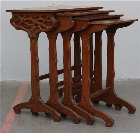 Gruppo di quattro tavolini Liberty a nido in legno di rovere massello intagliato e intarsiato a motivi vegetali alla maniera di Louis Majorelle. Italia, anni '20. (cm 59x70x38)(difetti)