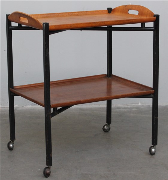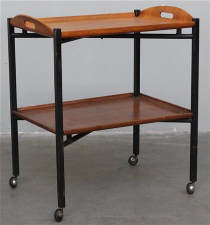 Carrellino. Bagnolo, anni '50/'60. Struttura in acciaio verniciato nero, vassoi asportabili in multistrato di teak curvato. Recante etichetta della produzione sotto il vassoio inferiore. (cm 60x68x42) (difetti)