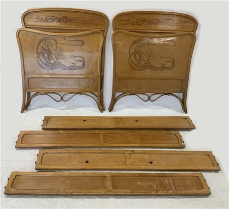 Coppia di letti singoli in con struttura in legno inciso a motivi Liberty. Ital