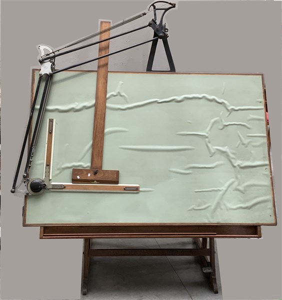 Tecnigrafo in legno e ferro unito ad una poltroncina da ufficio con struttura i