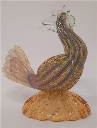 Seguso "Gallo" Scultura in vetro soffiato trasparente incolore iridato e ambrato