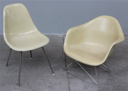 Lotto composto da una sedia modello "DSX" prodotta da Herman Miller e una poltroncina modello "LAR" prodotta da Zenith Plastics. Anni '70. Acciaio cromato e fibra di vetro. (cm 46x79x55; cm 65x64x60) (lievi difetti e mancanze)