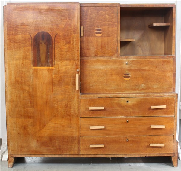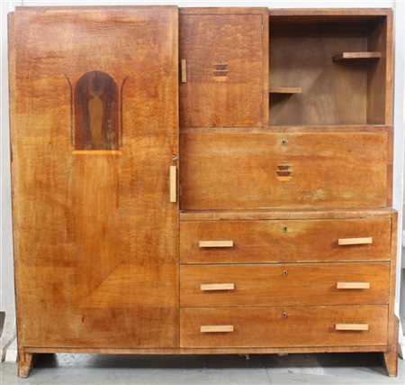 Credenza in legno bordato, impiallacciato e massello con cassetti, stipi ad anta e ribalta e vano a giorno. Fronti intarsiati con motivi Novecento. Italia, anni '20/'30. (cm 163,5x160x50) (difetti)