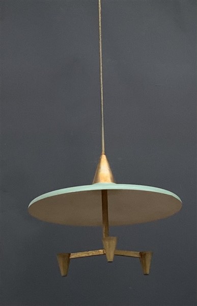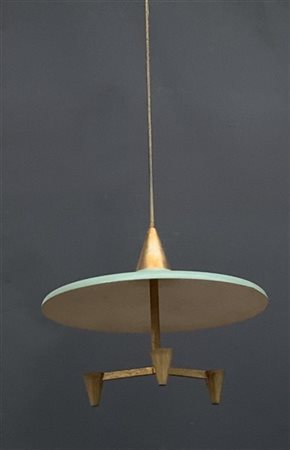 Lampada a sospensione a tre fiamme. Struttura in ottone e paralume in metallo verniciato verde acqua. (h cm 110) (difetti e piccole mancanze)