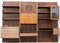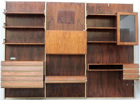 Libreria a tre moduli in legno impiallacciato e bordato e alluminio, composta da sei mensole a giorno, sei cassetti, tre cassettini, un anta laterale e uno stipo centrale a ribalta. Italia, anni '70. (cm 291,5x220,5x47) (difetti e mancanze)