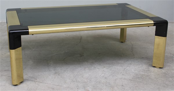 Tavolo da salotto con struttura in ottone lucido e verniciato nero, piano in cristallo fumé. Italia, anni '60. (cm 109x37x69) (lievi difetti)