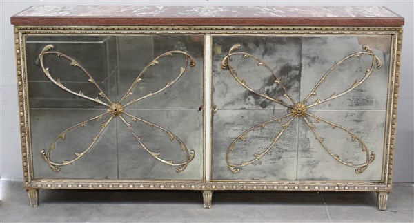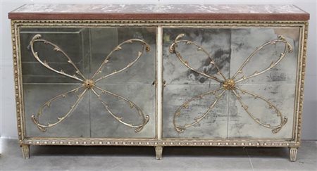 Credenza in legno verniciato bianco con decori intagliati in legno dorato, ante in vetro specchiato con decori in legno dorato e intagliato a motivo floreale. Piano in marmo. Italia, anni '40/'50. (cm 188x100x43) (difetti e mancanze)
