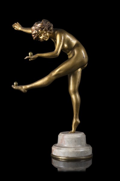 Claire Jeanne Roberte Colinet "Giocoliera" Scultura in bronzo con base in marmo.