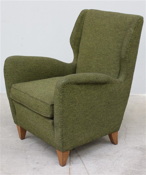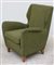 Poltrona con struttura in legno imbottita e rivestita in lana verde. Italia, an