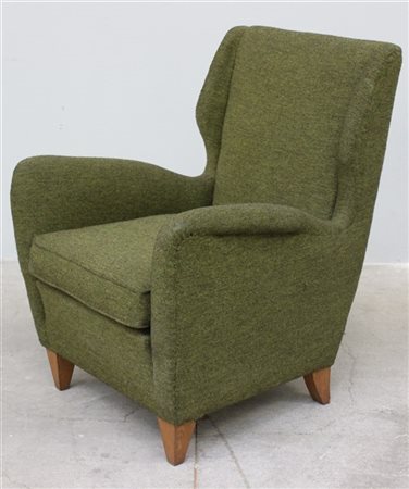 Poltrona con struttura in legno imbottita e rivestita in lana verde. Italia, anni '50. (cm 68x90x70) (lievi difetti e sostituzioni)