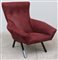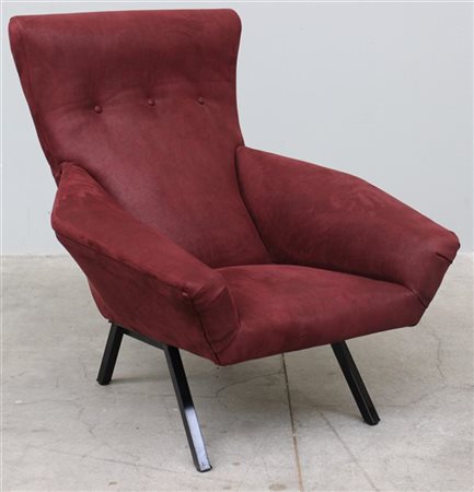 Poltrona imbottita e rivestita in alcantara bordeaux, struttura in metallo verniciato nero. Italia, anni '70. Recante etichetta adesiva sotto la seduta. (cm 85x90x95) (restauri)
