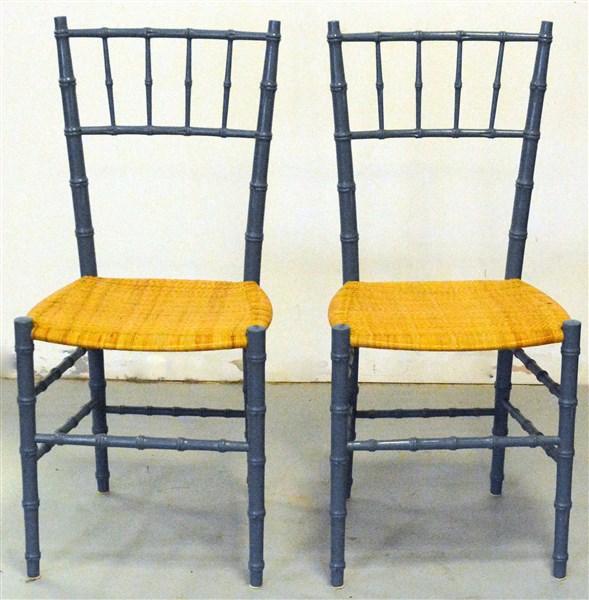 Coppia di chiavarine con struttura in legno verniciato color celeste, seduta in paglia intrecciata, cuscino imbottito e rivestito in tessuto azzurro. (cm 40x90x35)