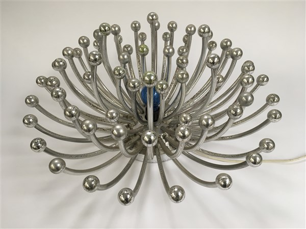 Lampada da tavolo con luce centrale modello "Pistillo". Produzione Valenti, Italia, 1969. Elementi stampati in abs argentato. Marcata sotto la base. (h cm 31,5; d cm 62) (difetti)