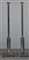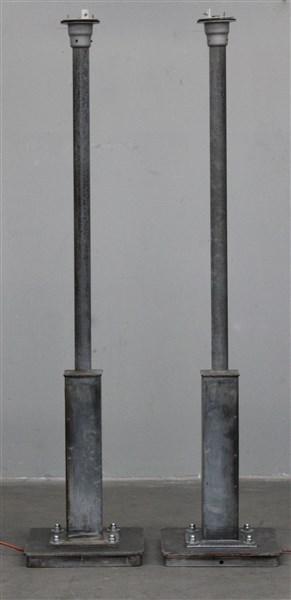 Coppia di lampade industriali con struttura in metallo e paralumi in vetro acidato. Francia, anni '70. (h cm 208) (lievi difetti)